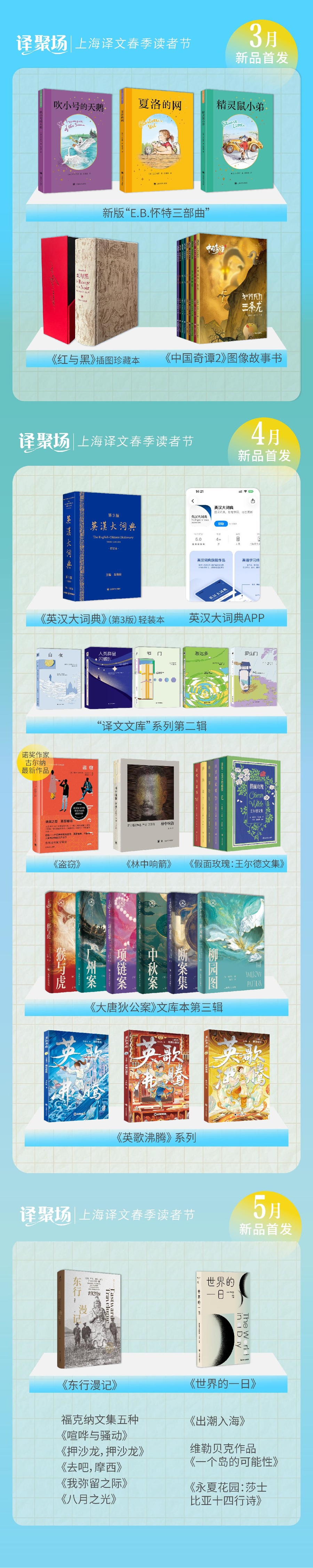 继今年3月首发《夏洛的网》《精灵鼠小弟》《吹小号的天鹅》焕新版、《英汉大词典》(第3版)轻装本及APP、《中国奇谭2》图像故事书后,读者节期间,上海译文出版社还将首发20余本重磅新书,包括诺奖作家古尔纳最新作品《盗窃》、以轻便装帧将阅读纳入日常生活的“译文文库”第二辑、《假面玫瑰:王尔德文集》、陈楸帆青少年科幻《英歌沸腾》三部曲、《林中响箭:苗炜重读鲁迅、严复、王国维》、90后历史博主邹德怀原创非虚构图文著作《东行漫记:大师、军阀、瑞典王储与1920年代的中国》等;44个国家、232个城市数千人参与的“世界的一日”写作项目也将迎来作品集《世界的一日》出版首发。